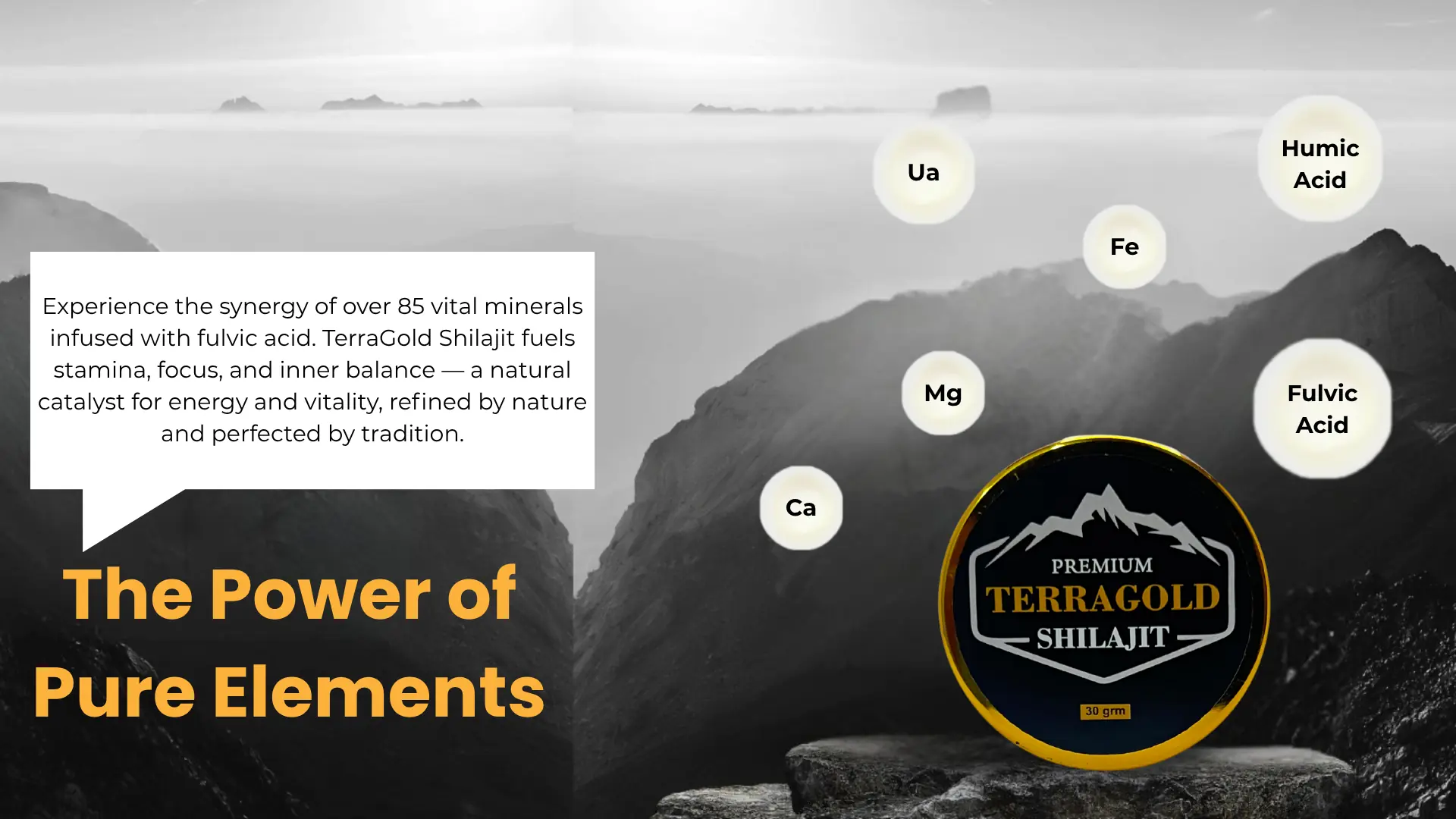 Unlock the true power of nature with TerraGold Shilajit, a 100% pure and natural resin sourced from the pristine heights of the Himalayas. Rich in fulvic acid, humic compounds, and over 85 essential minerals, this ancient Ayurvedic remedy is crafted to restore balance, enhance energy, and promote complete well-being. Each drop of TerraGold Shilajit delivers concentrated nutrition that nourishes your body at a cellular level, supporting both physical and mental vitality.