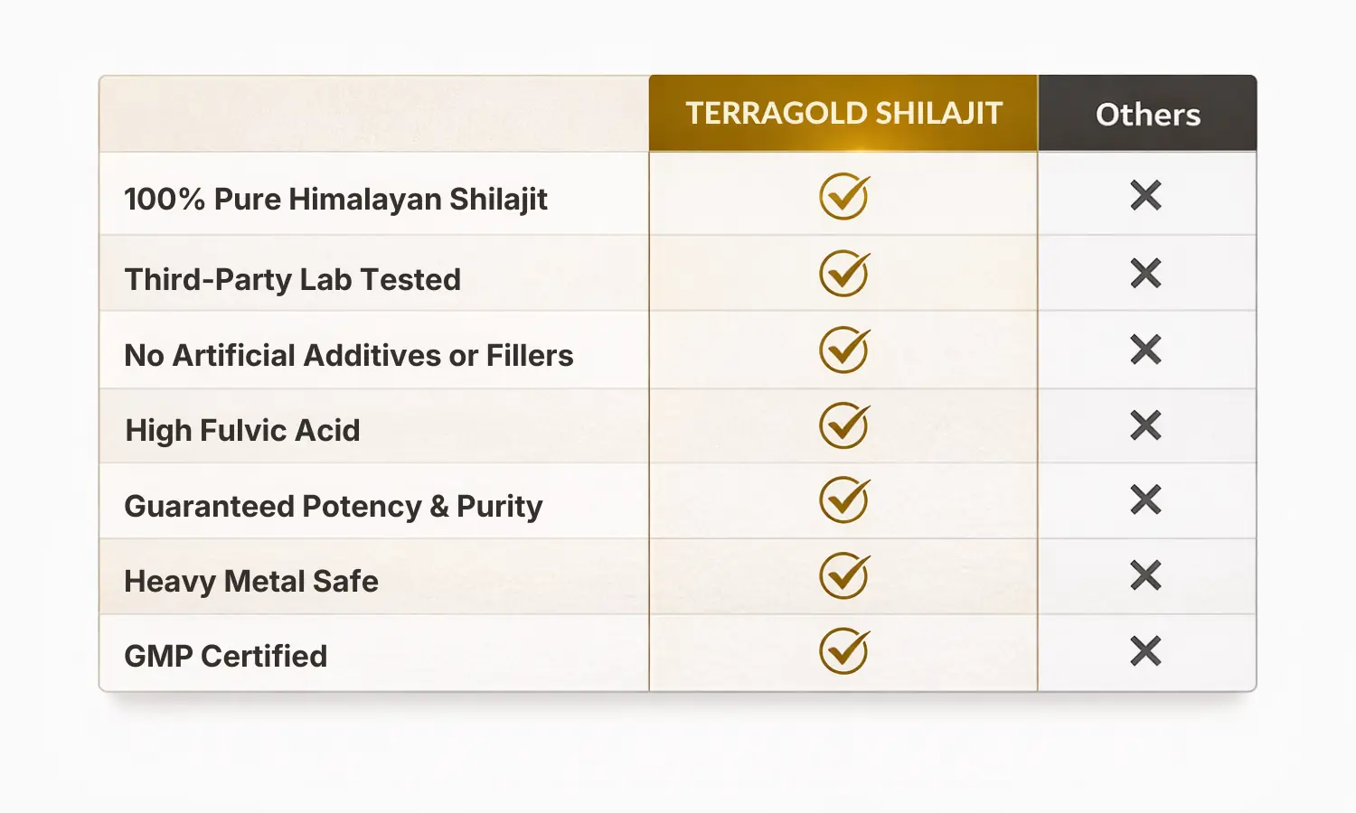 What makes TerraGold stand apart is its uncompromising purity and authenticity. Our Shilajit is third-party lab tested, GMP-certified, and free from heavy metals, additives, or preservatives. Each jar undergoes strict quality control to ensure you receive only the highest grade, premium quality Himalayan Shilajit potent, safe, and effective.